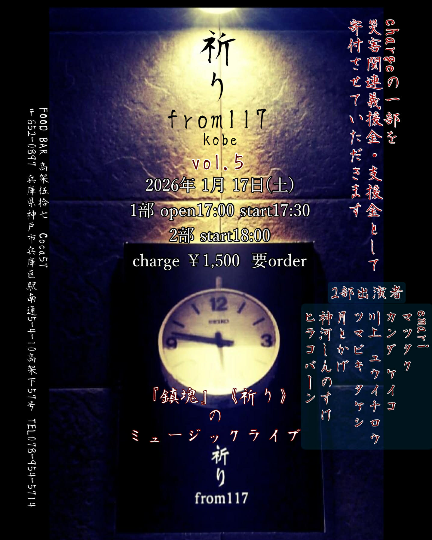 イベントスケジュール カテゴリ ライブ 定休日 臨時休業 貸切 通常営業 日程表 日程表 日 月 週 12月 2025 – 1月 2026 12月 2025 – 1月 2026 すべて閉じる すべて開く 12月 29 月 田中たつじの「今から、ここから」18時オープン チケット 12月 29日 6:30 PM LIVE予定 チケット 12月 29日 10:36 PM 1月 7 水 じっちゃんの「昼の水妖怪」12時開場 チケット 1月 7日 12:15 PM 1月 9 金 カメカメパラダイス17時30分開場 チケット 1月 9日 6:00 PM 1月 10 土 サトコリンの沖縄DEナイト18時開場 チケット 1月 10日 3:16 PM 1月 11 日 まっちゃんLIVE 17時30分開場 チケット 1月 11日 6:00 PM 1月 13 火 「ベジマイ的オープンマイク」18時開場 チケット 1月 13日 6:30 PM 1月 14 水 じっちゃんの「昼の水妖怪」12時開場 チケット 1月 14日 12:15 PM 1月 16 金 菅原通り一本道オープンマイク 18時開場 チケット 1月 16日 6:30 PM 1月 17 土 『祈り〜from117〜kobe vol.5』 open17:00 チケット 1月 17日 5:30 PM 12月 2025 – 1月 2026 12月 2025 – 1月 2026 フィルタされたカレンダーに登録 Timelyカレンダーに追加 Googleに追加 Outlookに追加 Appleカレンダーに追加 その他のカレンダーに追加 Export to XML