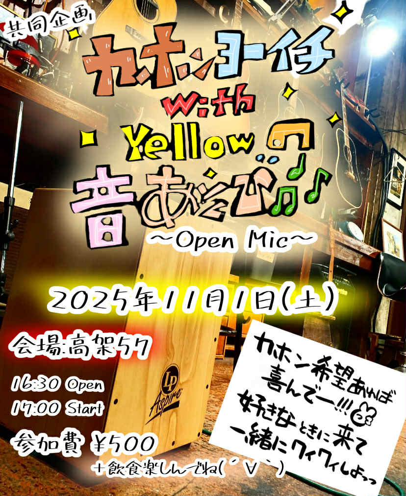 カホンヨーイチ with YeIIow音あそびオープンマイク🎤16時30分開場 2025年10月8日 by Master·カホンヨーイチ with YeIIow音あそびオープンマイク🎤16時30分開場 はコメントを受け付けていません Calendar カレンダーに追加 Timelyカレンダーに追加 Googleに追加 Outlookに追加 Appleカレンダーに追加 その他のカレンダーに追加 Export to XML いつ: 2025年11月1日 5:00 PM 2025-11-01T17:00:00+09:00 2025-11-01T17:15:00+09:00 料金: Charge¥500飲食別要オーダー ライブ