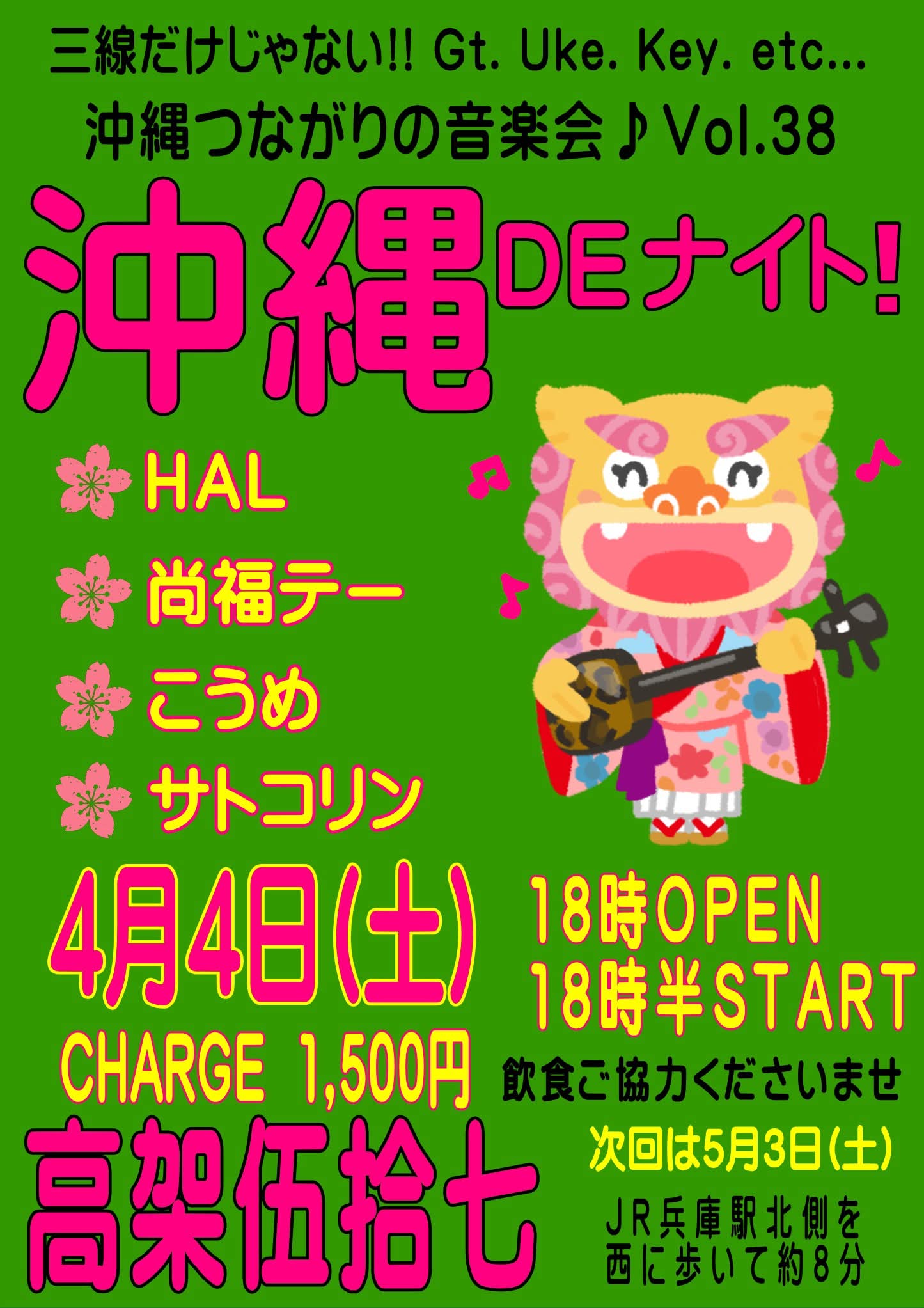 サトコリンの沖縄DEナイト18時開場 2025年5月20日 by Master·サトコリンの沖縄DEナイト18時開場 はコメントを受け付けていません Calendar カレンダーに追加 Timelyカレンダーに追加 Googleに追加 Outlookに追加 Appleカレンダーに追加 その他のカレンダーに追加 Export to XML いつ: 2026年4月4日 6:30 PM 2026-04-04T18:30:00+09:00 2026-04-04T18:45:00+09:00 料金: Charge¥1500飲食別要オーダー ライブ